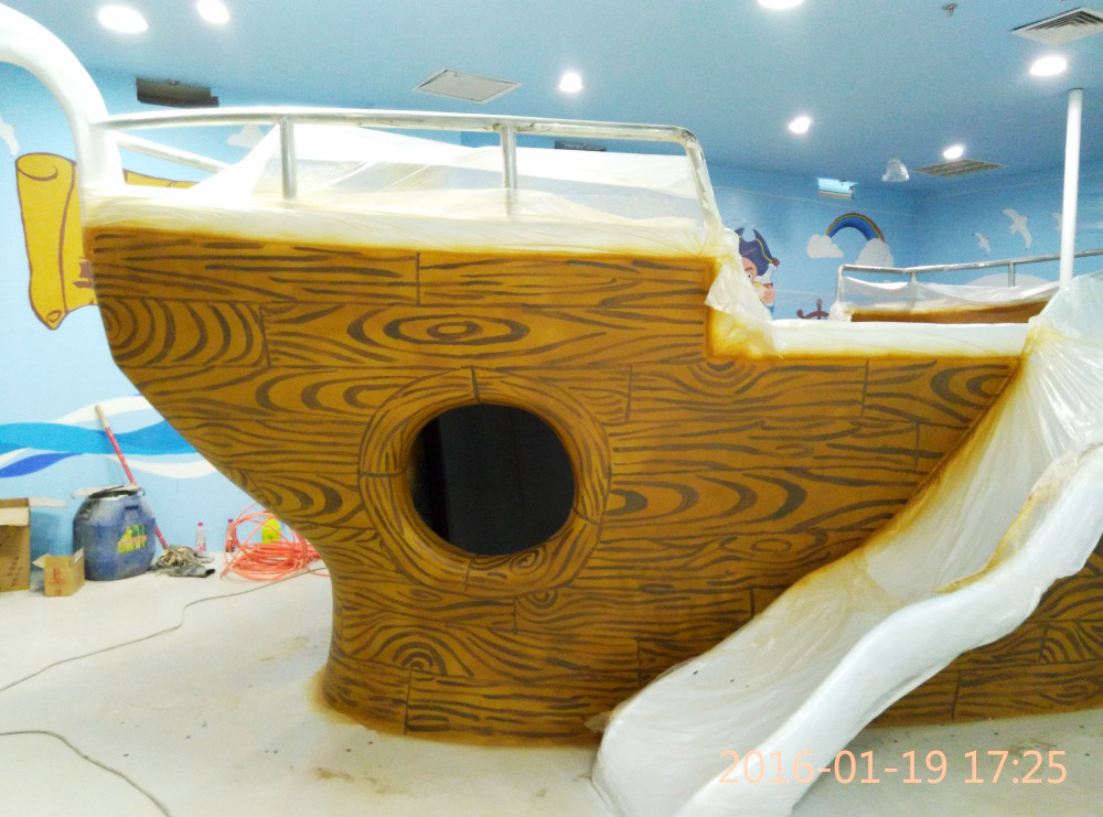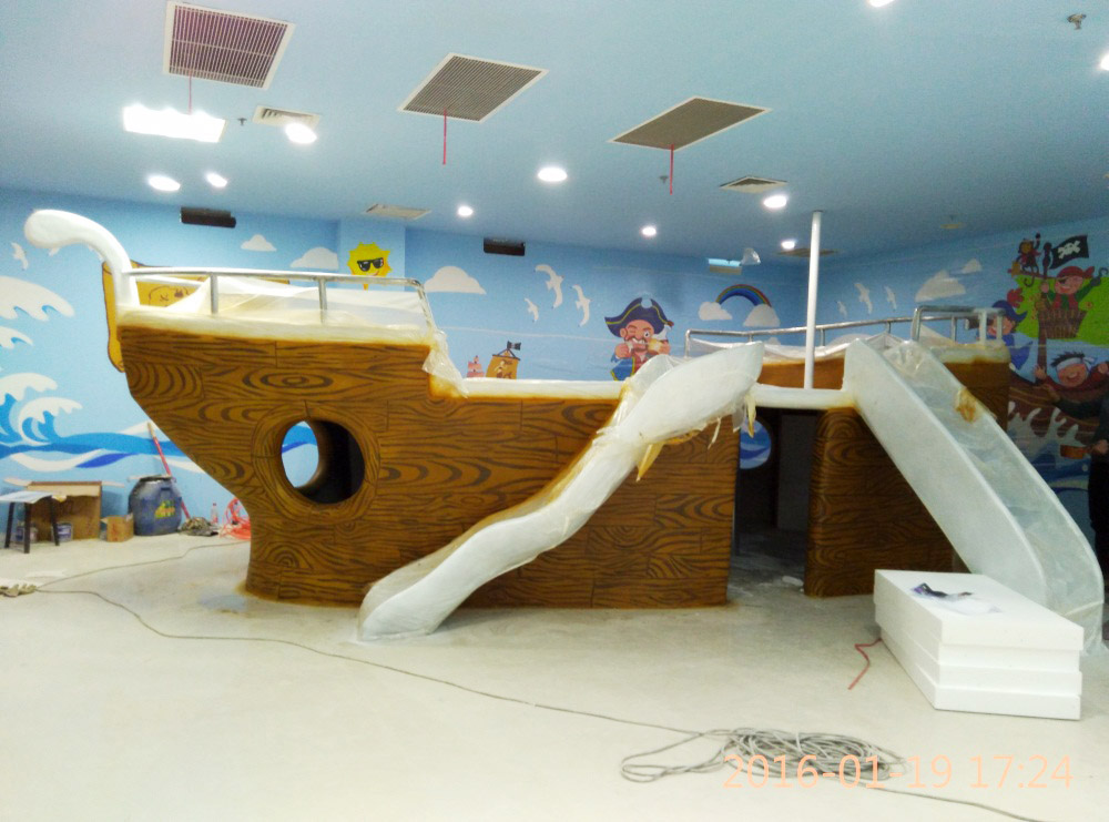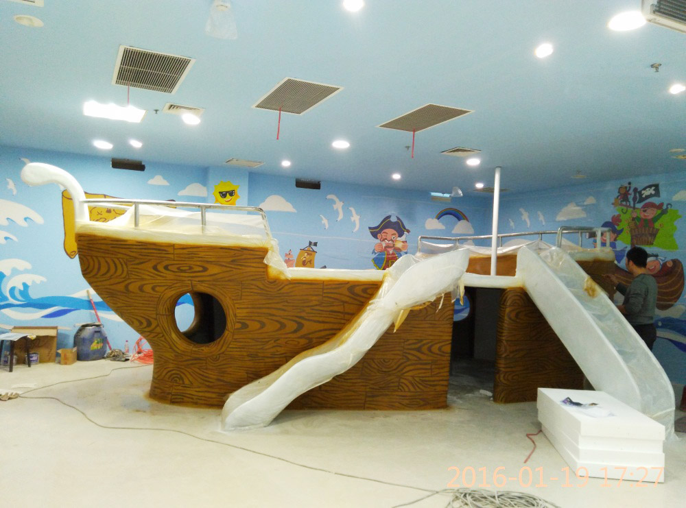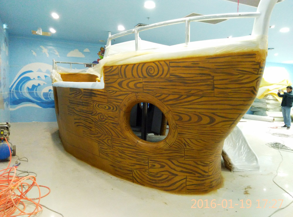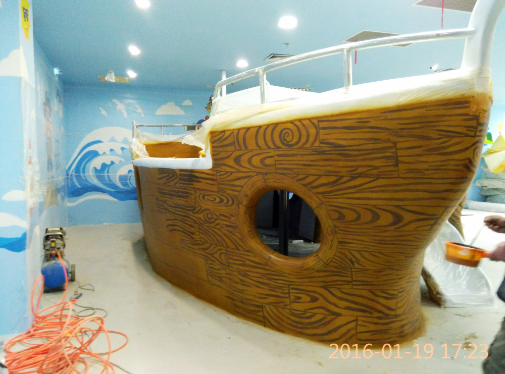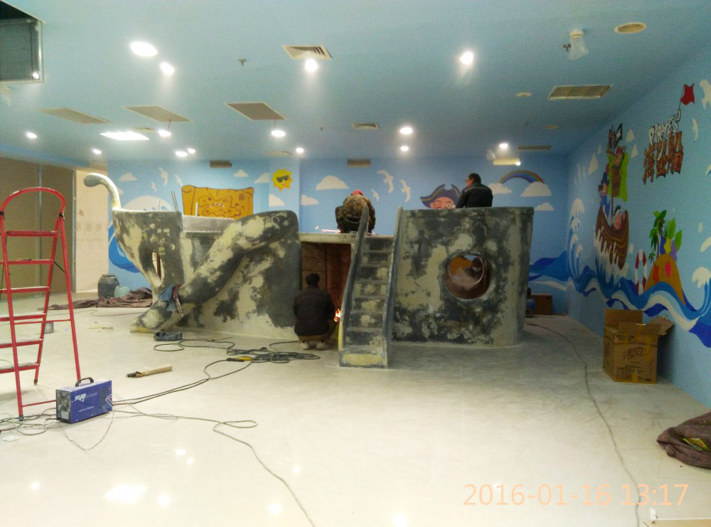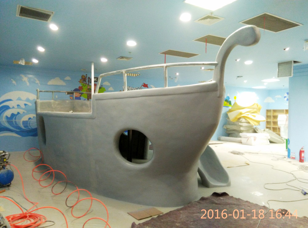 大型玻璃鋼游樂船雕塑竣工。2016年1月15-1月19日安裝于山東省濱州市黃河五路渤海十路銀座商城黃河店四樓。