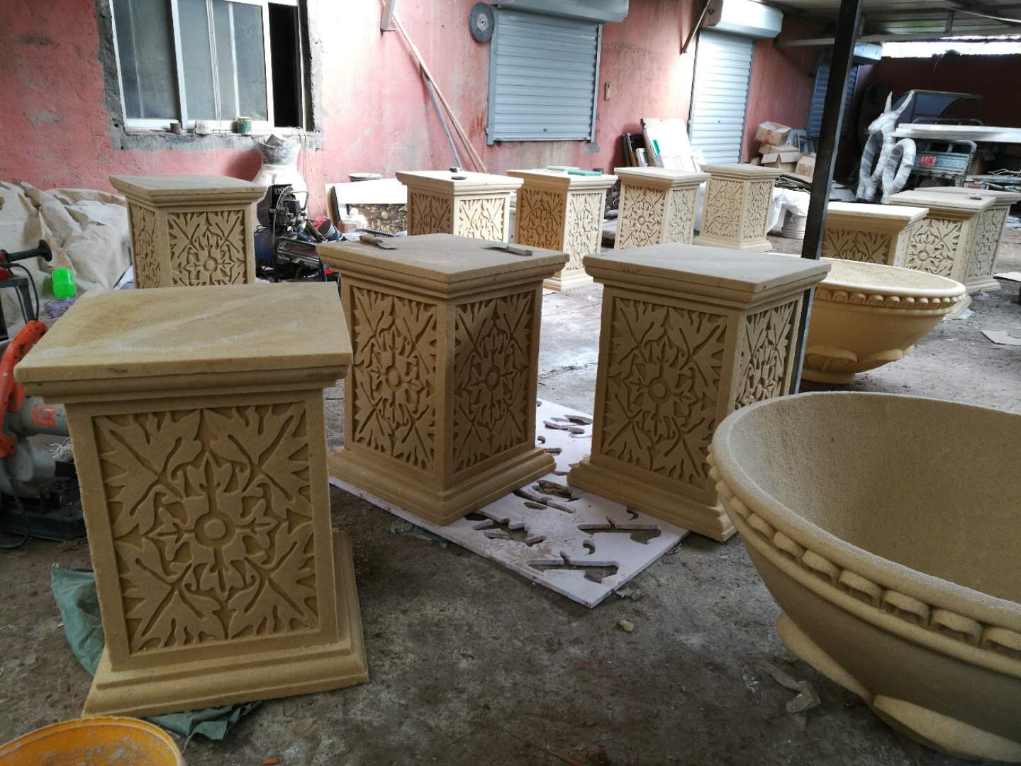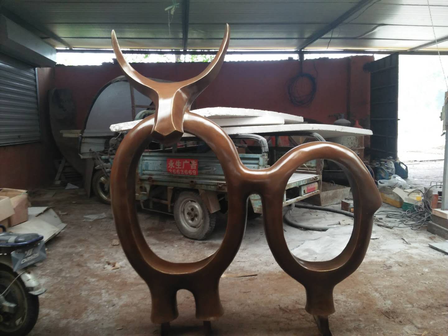 施工內(nèi)容:玻璃鋼牛雕塑、騎車人——不銹鋼雕塑、砂巖花缽雕塑。